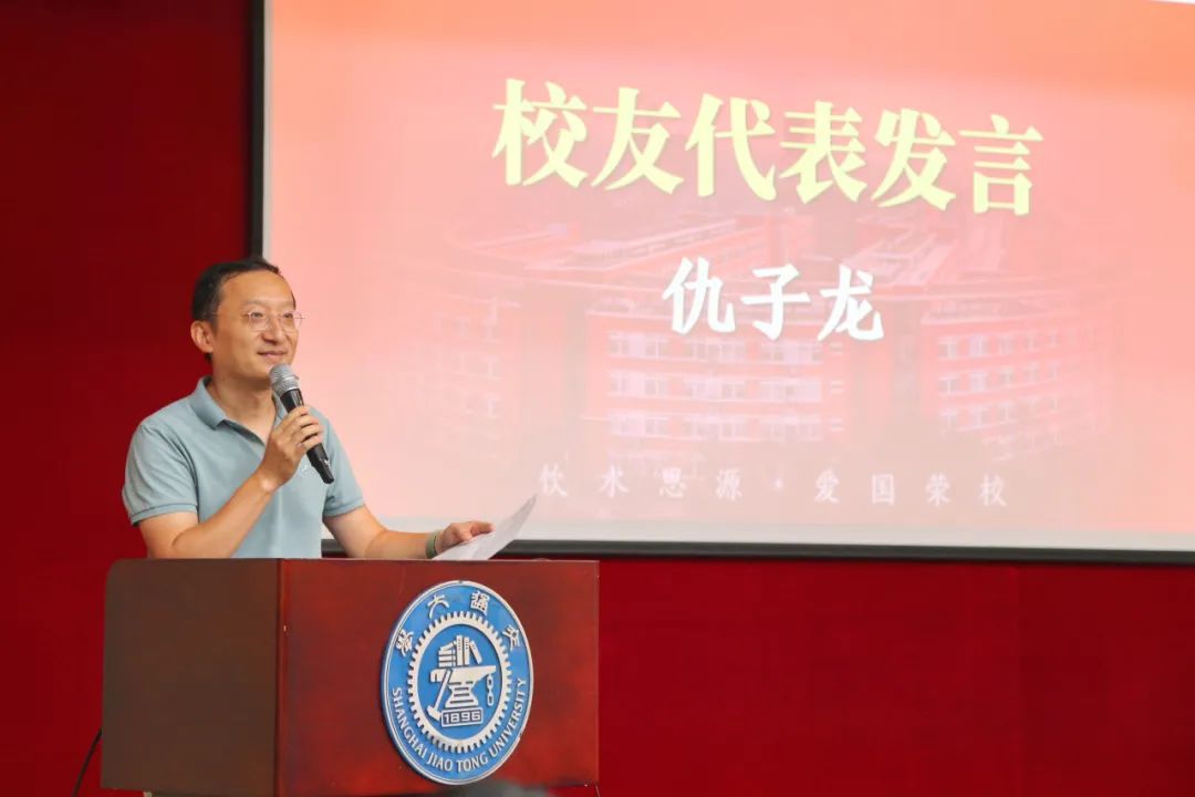 校友代表1998届本科校友仇子龙发言。他回顾了大学生活的经历,提出了梦想与现实两个主题,鼓励同学们在当今生物医药产业愈发重要的“硬科技时代”勇敢逐梦。随后,他结合自己的科研成果转化经历寄语新同学:掌握学会学习的能力。最后,仇子龙祝愿同学们胸怀梦想,脚踏实地,手握 AI,在“硬科技时代”自由翱翔。