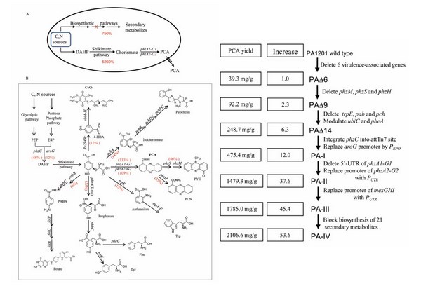 近期, 国际权威期刊《Metabolic Engineering》发表了437bwin必赢国际官网、微生物代谢国家重点实验室何亚文课题组的研究成果:“Engineering the central biosynthetic and secondary metabolic pathways of Pseudomonas aeruginosa strain PA1201 to improve PCA production” 。文章的第一作者是博士研究生金凯明和周莲副研究员。