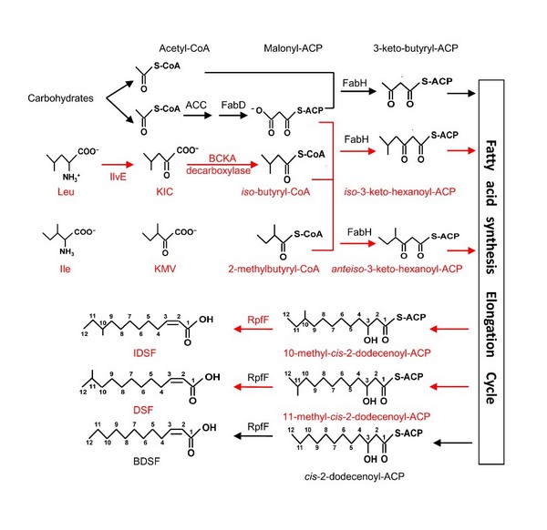 进一步的研究中课题组建立了更灵敏的DSF检测方法,鉴定了四种DSF家族群体感应信号(DSF,BDSF, CDSF和IDSF)的结构,发现DSF合成酶RpfF同时具有脱水酶和硫酯酶的双重功能,阐明了DSF、BDSF和IDSF的生物合成前体,建立了DSF家族信号分子的生物合成途径。