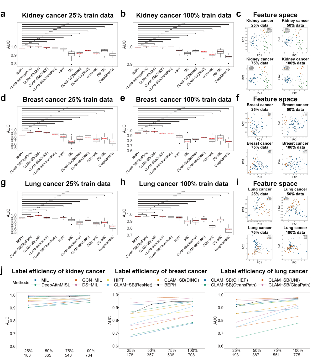 多种实验证明,BEPH能够灵活地适应多种计算病理学任务,在Patch级和WSI级的癌症诊断以及生存风险预测方面,取得了显著的改进。比如WSI级别的亚型分类任务中,在多个不同的癌症类型上,BEPH全面优于其他弱监督模型。即使在训练数据减少时,模型依旧保留较高的性能,表明模型能有效缓解临床环境中数据收集的难题。