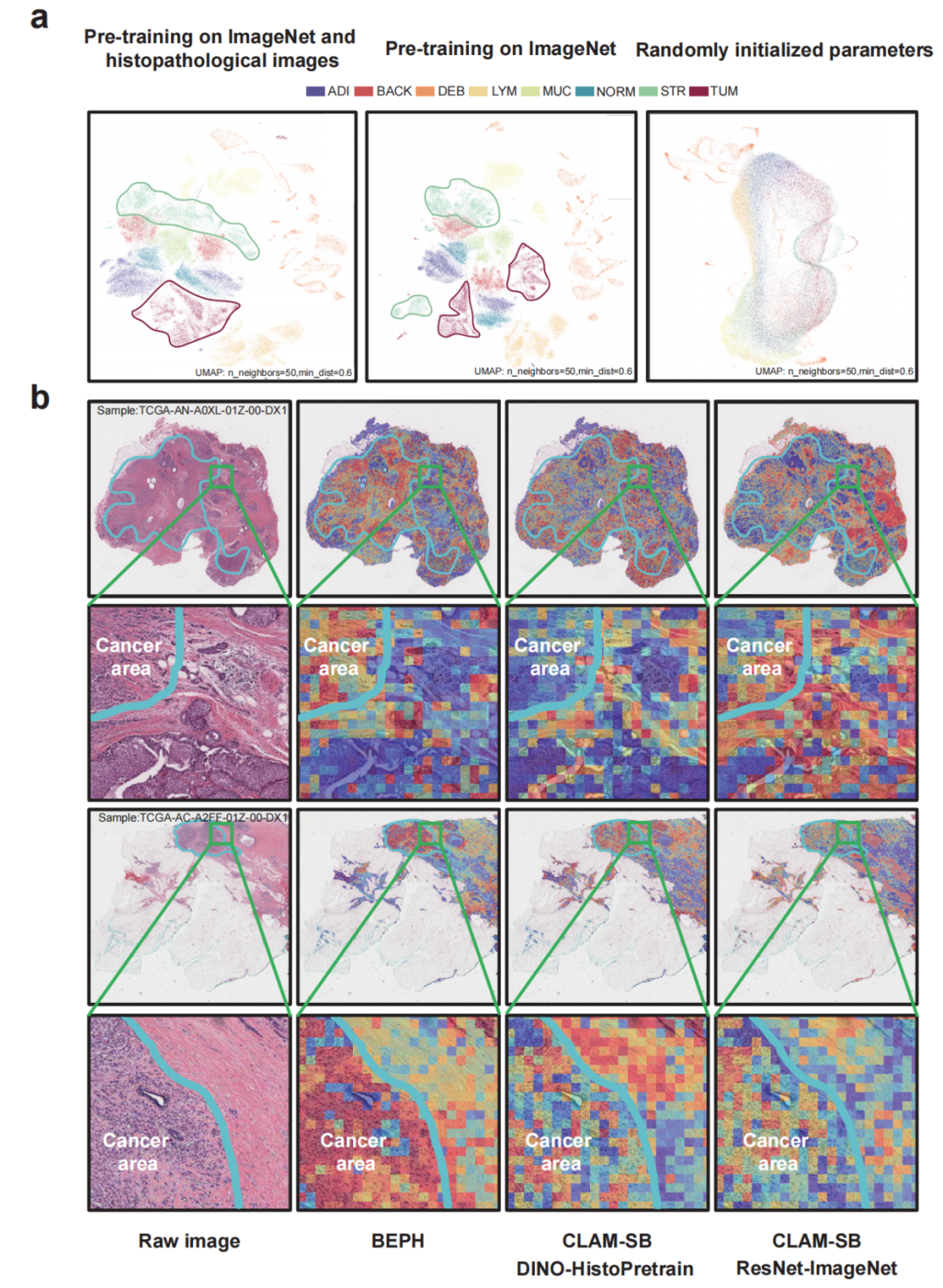 BEPH在WSI级别的癌症检测任务中进一步的热图分析表明,其注意力区域(红色区域)与病理学家标注的癌变区域高度一致,说明模型能够自动关注真正的病理特征。其他模型的关注区域较为分散,部分模型甚至未能准确定位癌变区域,表明BEPH对病理特征的判别能力更强。局部放大区域(绿色框)显示,BEPH的注意力更加聚焦在癌变区域及边界,而非随机关注整个组织,增强了模型的决策可靠性。