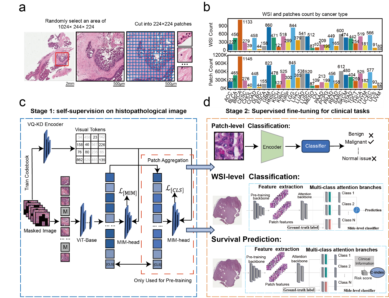 近期,437bwin必赢国际官网/交大医学院临床研究中心俞章盛教授课题组在《Nature Communications》在线发表“A foundation model for generalizable cancer diagnosis and survival prediction from histopathological images”论文。该研究开发一种通用的病理学基础模型—BEPH (BEiT-based model Pre-training on Histopathological image),用于癌症诊断和生存预测,以克服现有计算病理学方法的局限性。437bwin必赢国际官网硕士生杨钊昌,助理研究员魏婷为共同第一作者,437bwin必赢国际官网俞章盛教授和张岳副研究员为共同通讯作者。